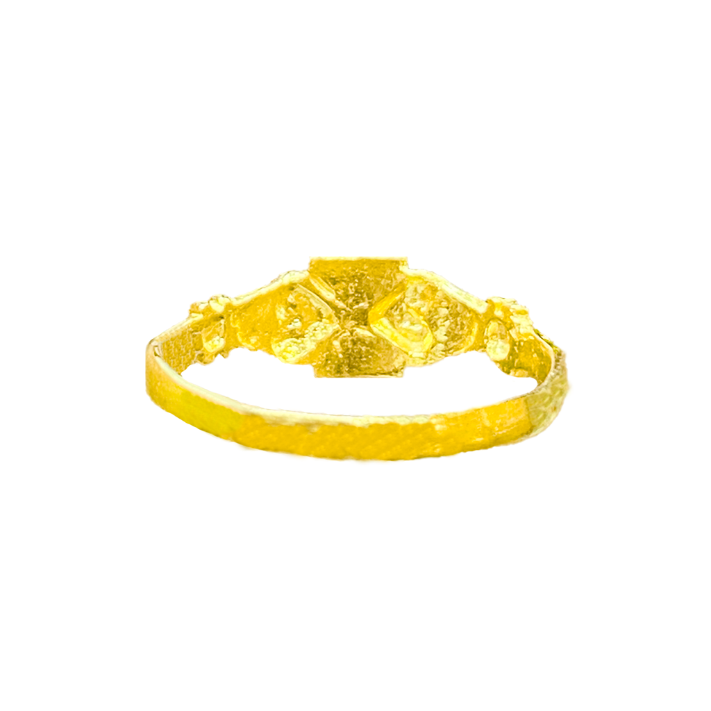 Make a modern statement with this unique 916 gold ring. This piece features a central geometric design with a combination of high-polish and textured surfaces that catch the light beautifully. The band has a stylish texture on both sides, leading to the central motif, giving it a contemporary and distinct look.