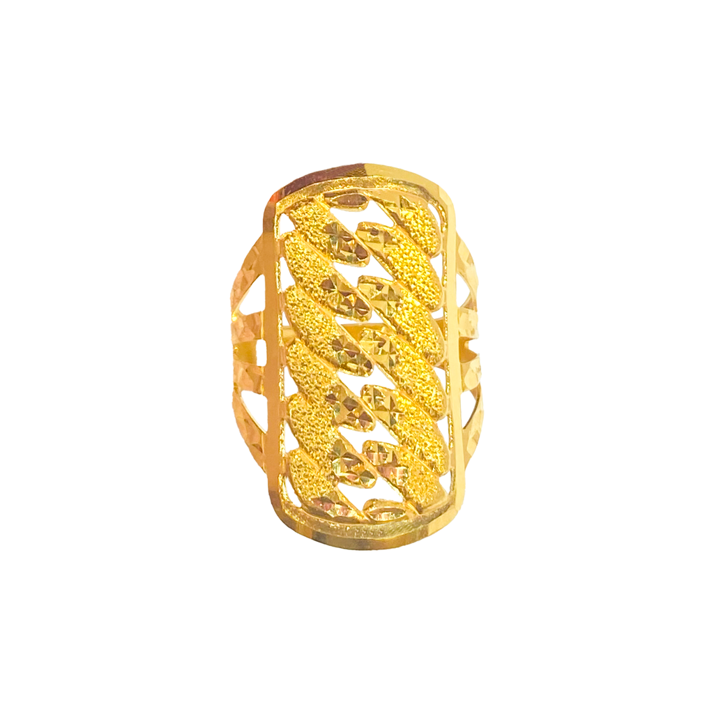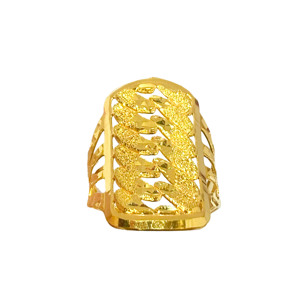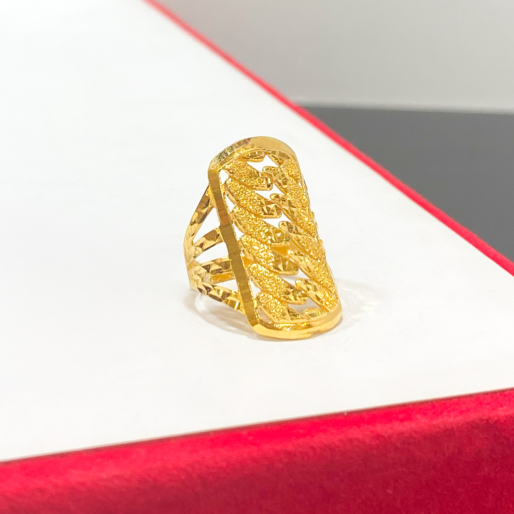 Embrace the beauty of nature with this exquisite 916 gold ring. Weighing 2.78 grams, this piece is a testament to fine craftsmanship and elegance. The wide band features a captivating pattern of alternating textured and polished "leaf" or "feather" motifs, creating a stunning visual contrast.