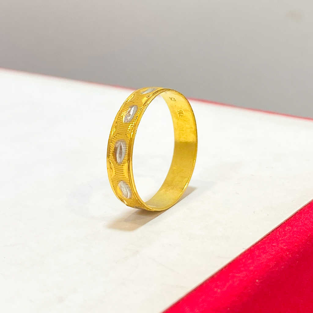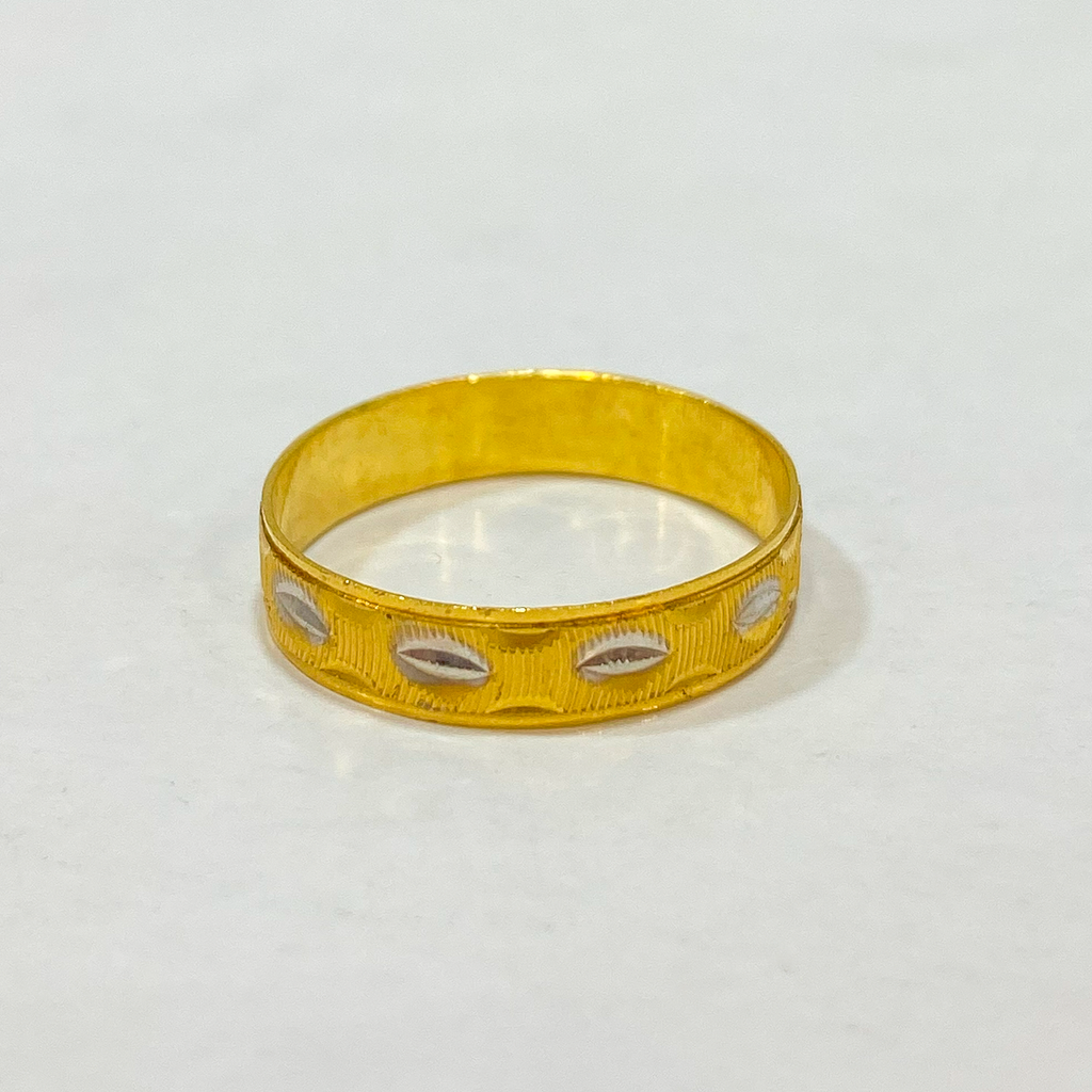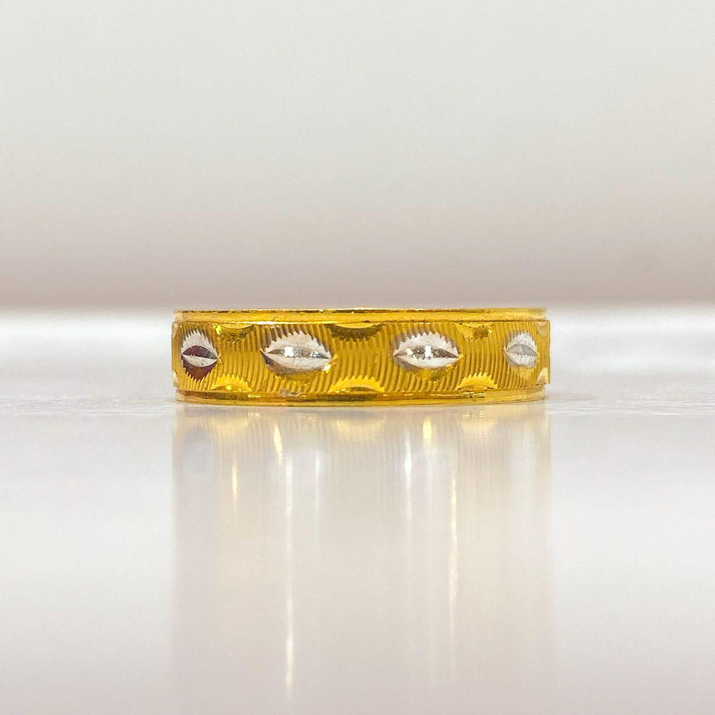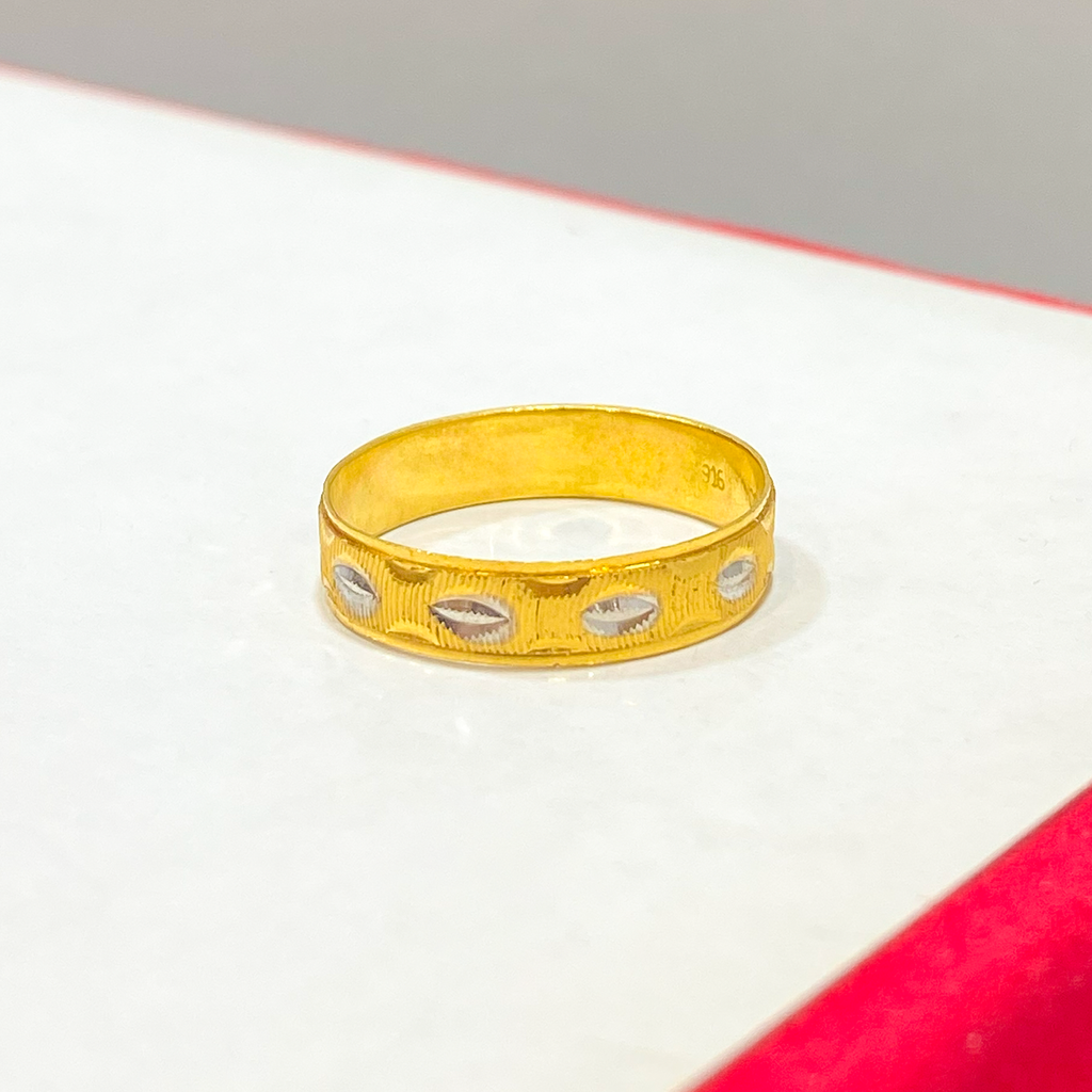 This beautifully crafted Emas 916 Cincin features a continuous band adorned with repeated marquise/eye-shaped patterns. The contrast between the brilliant Yellow Gold and the sleek, rhodium-plated White Gold elements gives the ring depth and a sophisticated look, often referred to as a two-tone gold ring.
