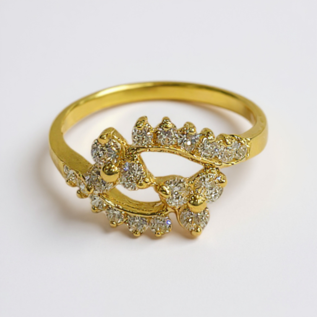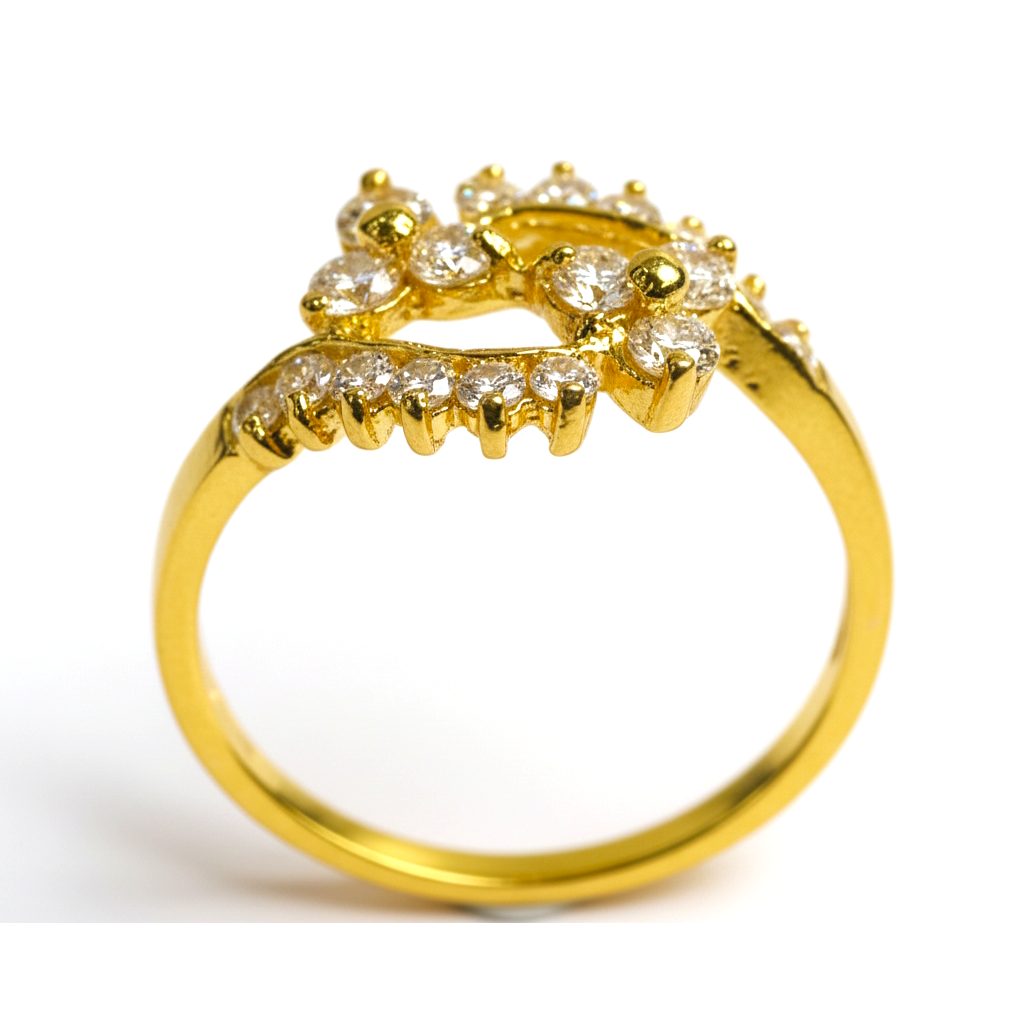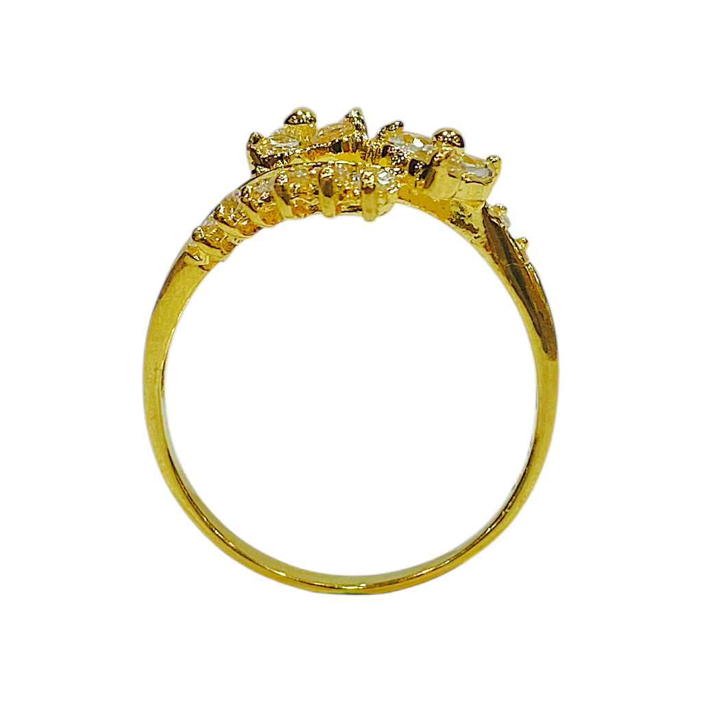 Elevate your jewelry collection with this stunning 18K yellow gold (750 hallmark) ring. Featuring a unique, fluid bypass design, this piece is meticulously handset with premium white zircons that capture the light from every angle.