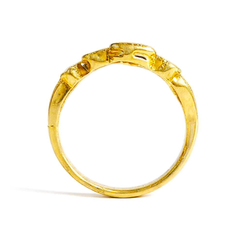 Express your love with this exquisite 750 (18K) yellow gold band ring. The ring features a unique and feminine design composed of five interlocking heart motifs that curve elegantly across the top of the finger.