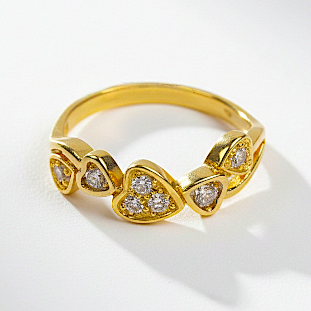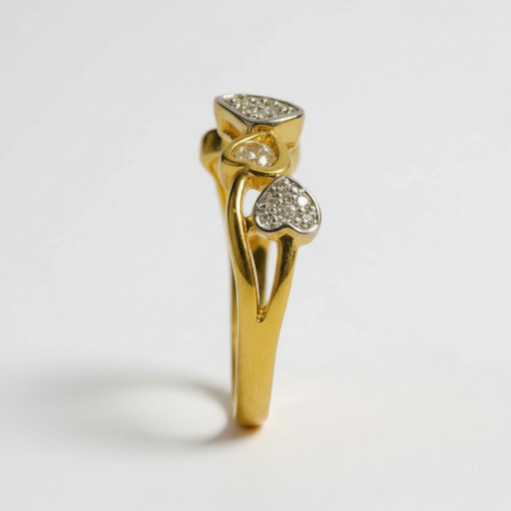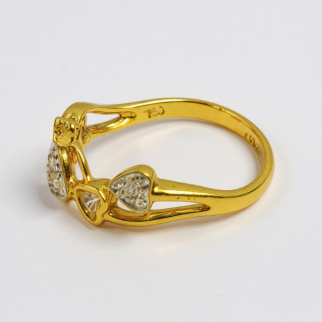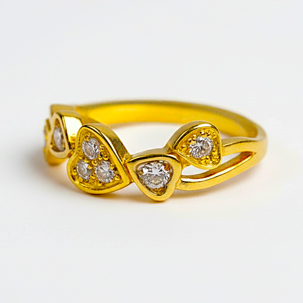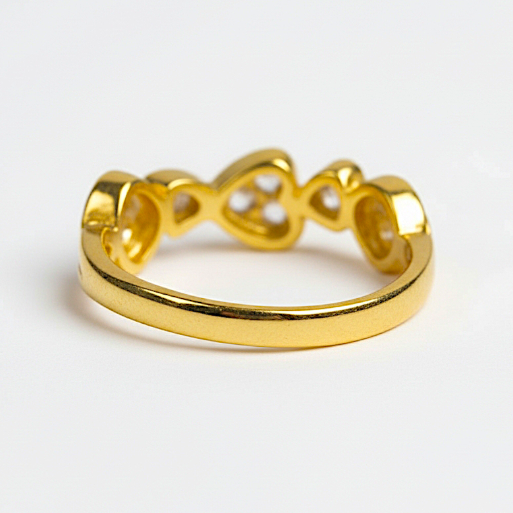 Each heart is meticulously set with brilliant clear zircons; the larger central heart features a cluster of three stones, while the flanking hearts each hold a single sparkling gem. The combination of the warm 18K gold luster and the radiant stones creates a classic, high-shine look perfect for an anniversary gift, a promise ring, or a meaningful addition to your jewelry collection.