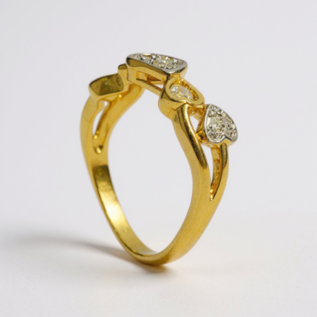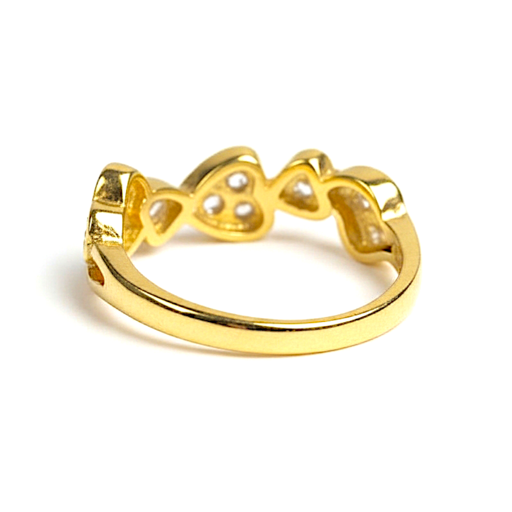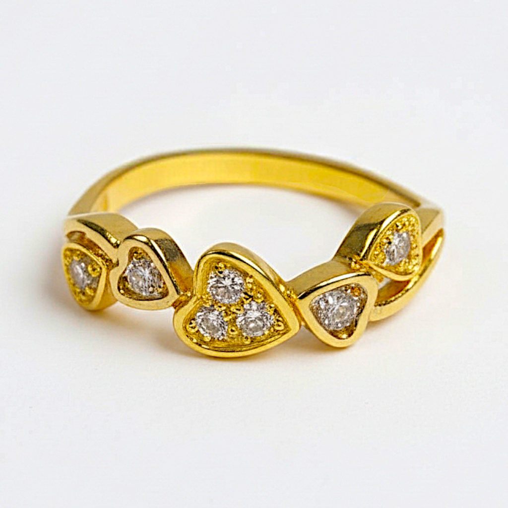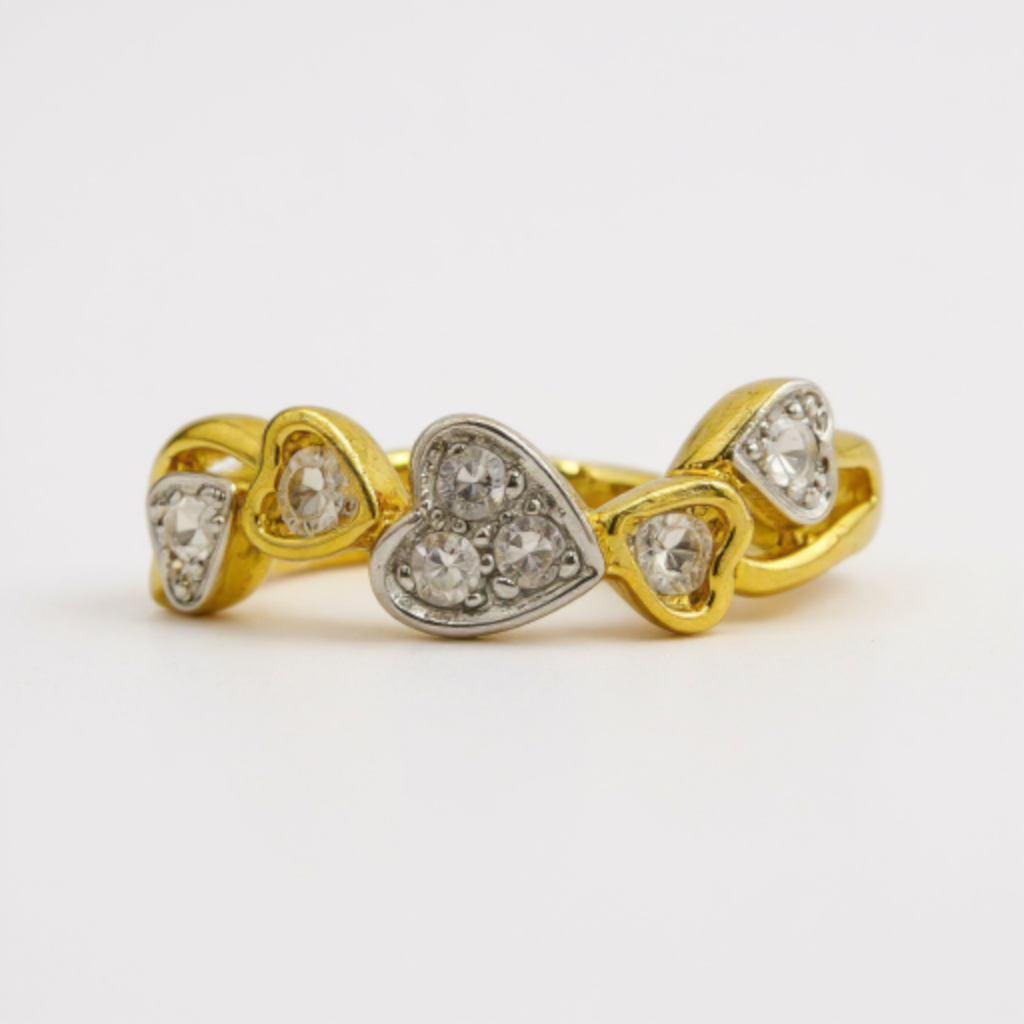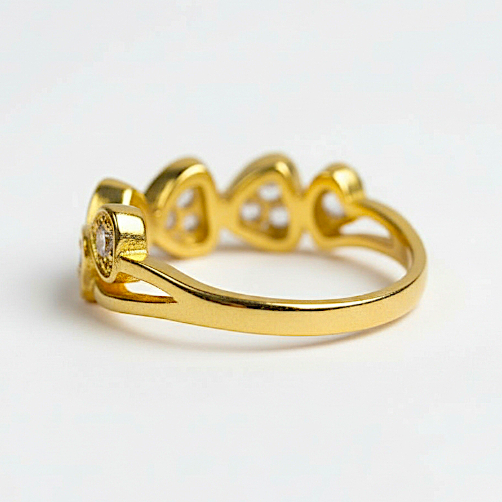 Each heart is meticulously set with brilliant clear zircons; the larger central heart features a cluster of three stones, while the flanking hearts each hold a single sparkling gem. The combination of the warm 18K gold luster and the radiant stones creates a classic, high-shine look perfect for an anniversary gift, a promise ring, or a meaningful addition to your jewelry collection.