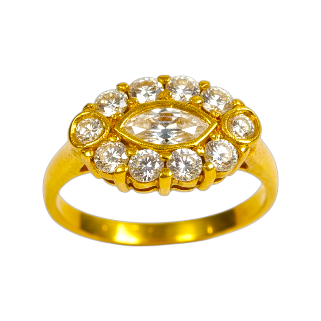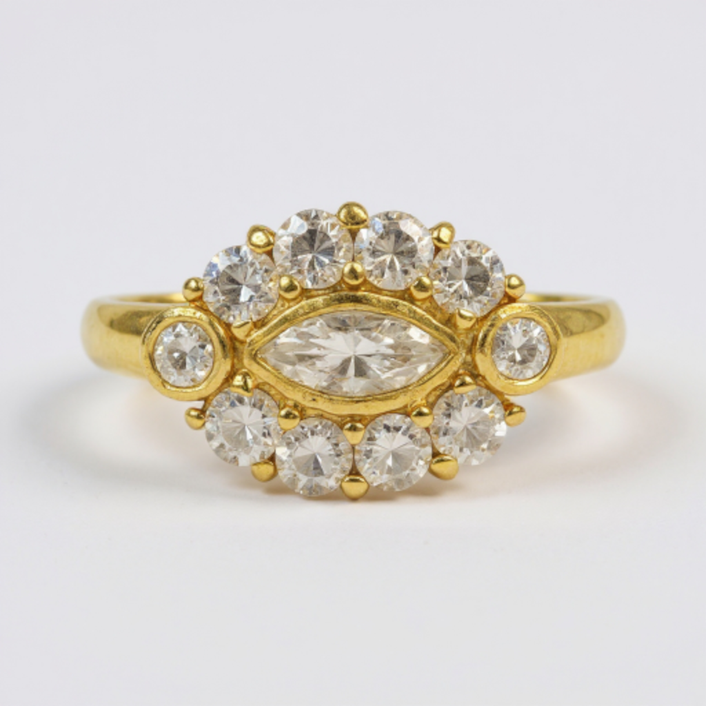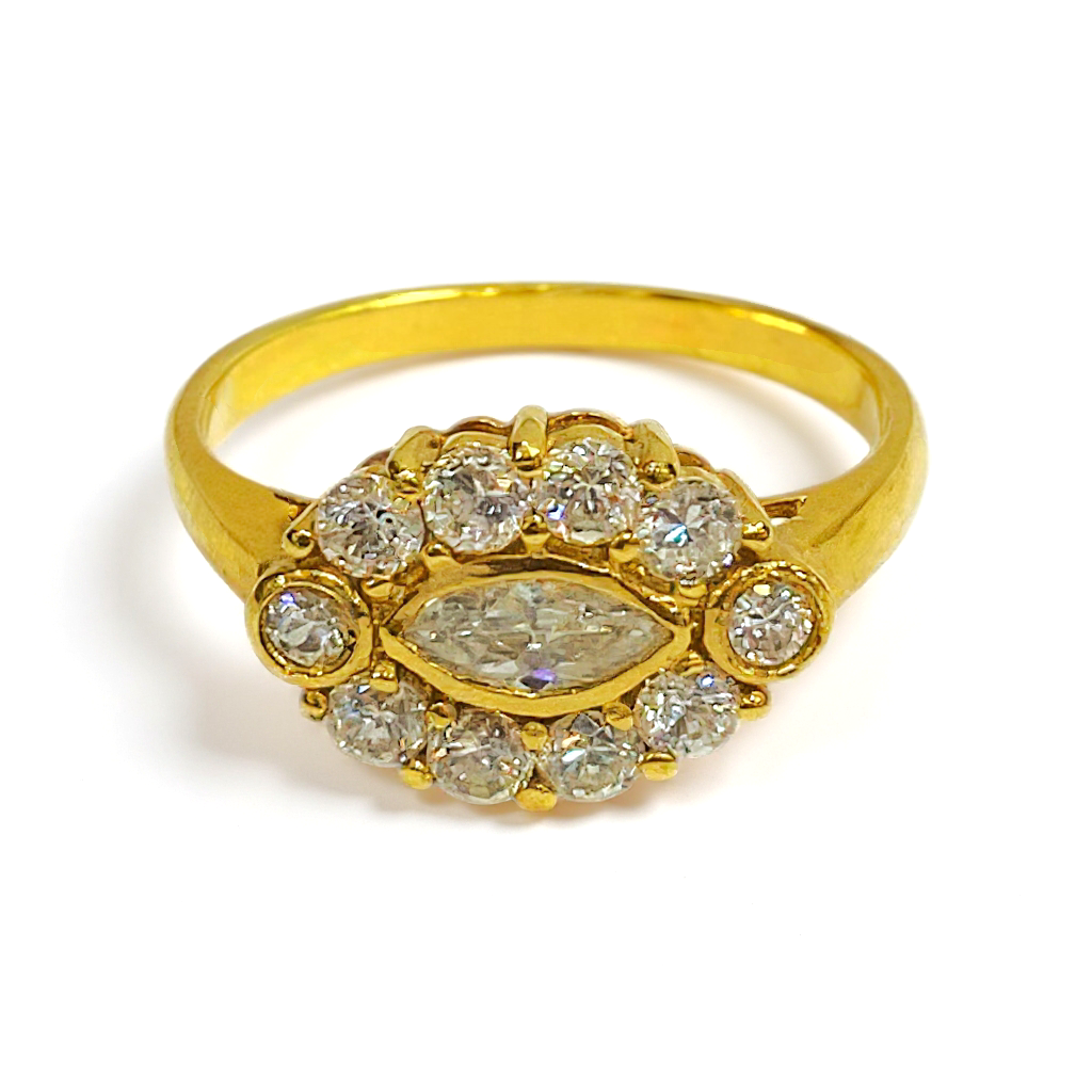 Pure 750 (18K) Yellow Gold Ornate Marquise-Cut Zircon Ring with Round Brilliant Halo and Side Accents (3.1g/Size: 14)