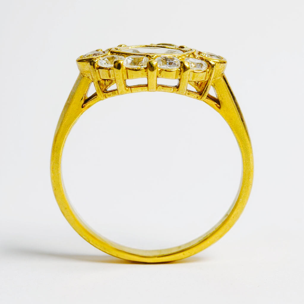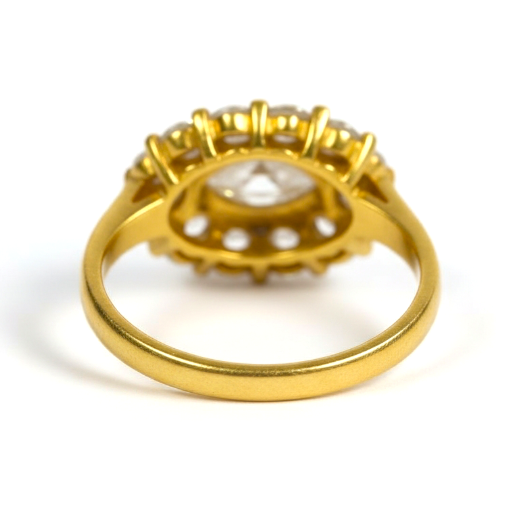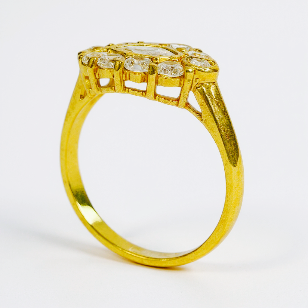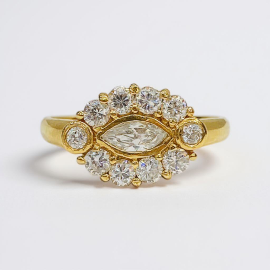 Pure 750 (18K) Yellow Gold Ornate Marquise-Cut Zircon Ring with Round Brilliant Halo and Side Accents (3.1g/Size: 14)