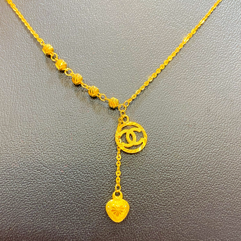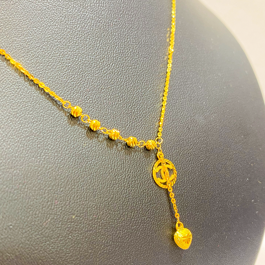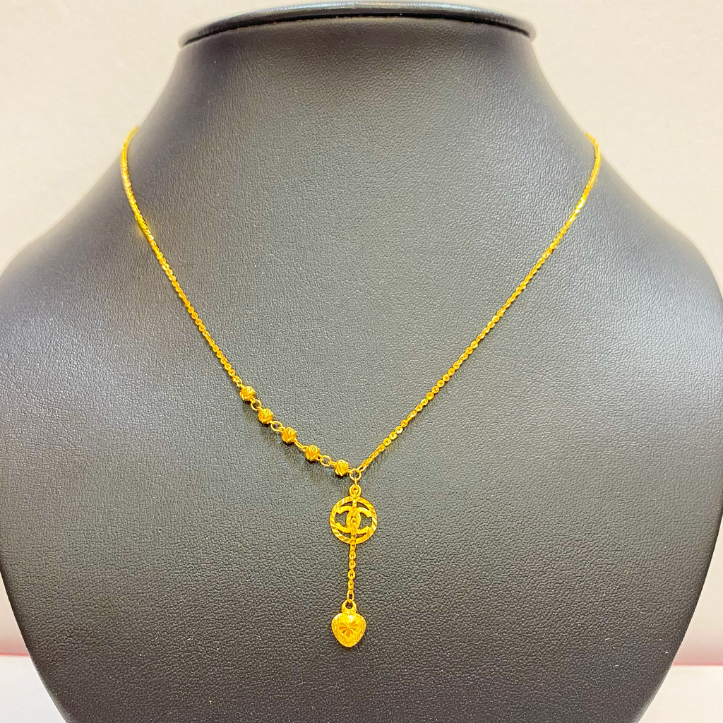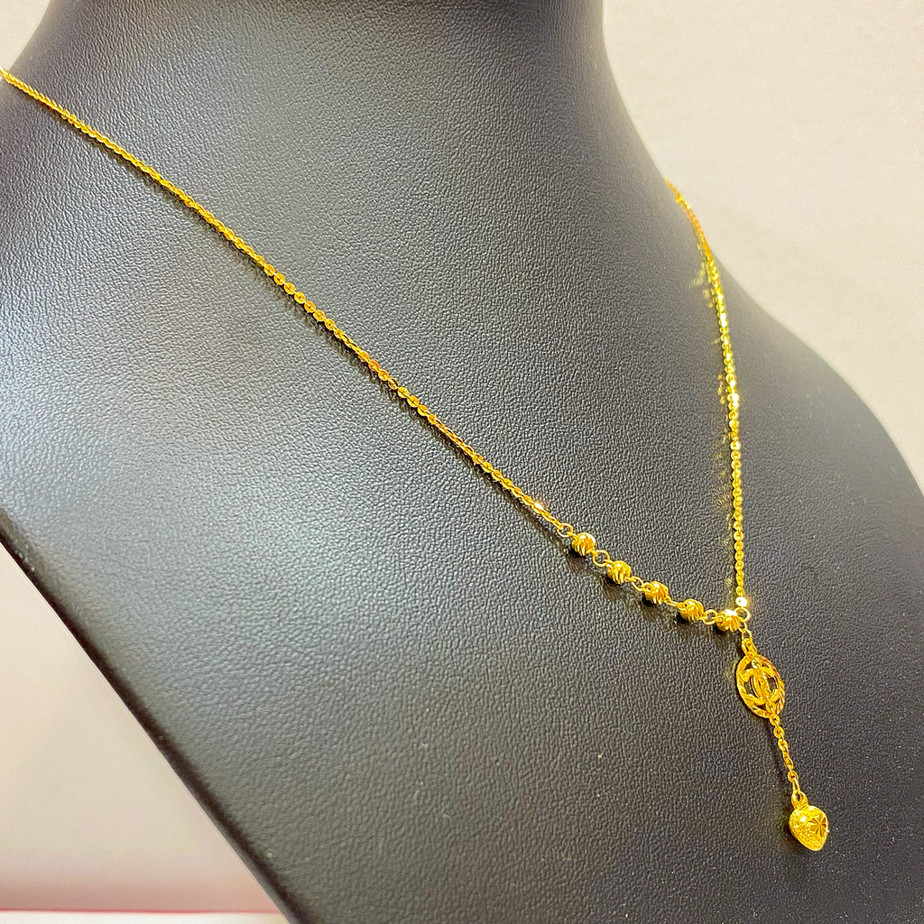 The necklace features a delicate chain accented by diamond-cut gold beads along the neckline for a continuous sparkle. The main feature is the Y-drop pendant, which begins with an elegant interlocking loop/circle design. A fine chain drops from the loop, ending in a charming diamond-cut heart charm. The high-shine finish and rich color of the 916 gold ensure this choker looks luxurious and holds lasting value.